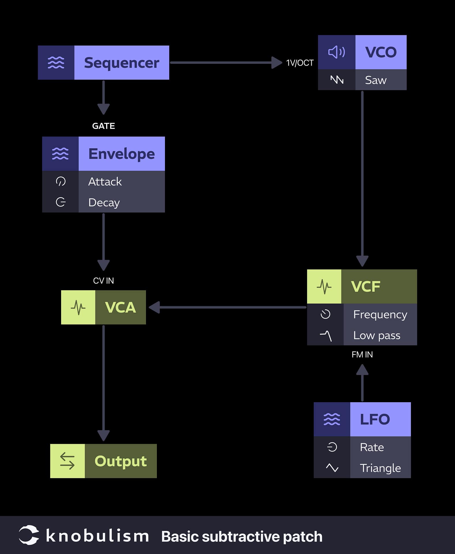 This illustrates a very simple subtractive synthesis patch and its signal flow. It is a good place to start to understand the relationship between inputs, outputs, CV, audio, jacks, and cables.