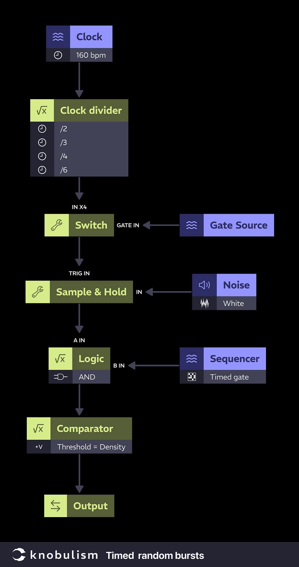 The Ultra-Random Redux is a complex random voltage generator with extensive modulation and probability features. Trying the patch the whole thing could turn into an article on its own. Instead, Let’s focus on one section and create timed bursts of random pulses. We will create three controls, one will control the rate of the bursts, the switch gate source toggles between rates. A second to control when the bursts happen, the sequencer gate allows the random bursts to pass. Finally a third to control the density of the gates in the burst, the comparator threshold parameter will decrease density the higher you set it..