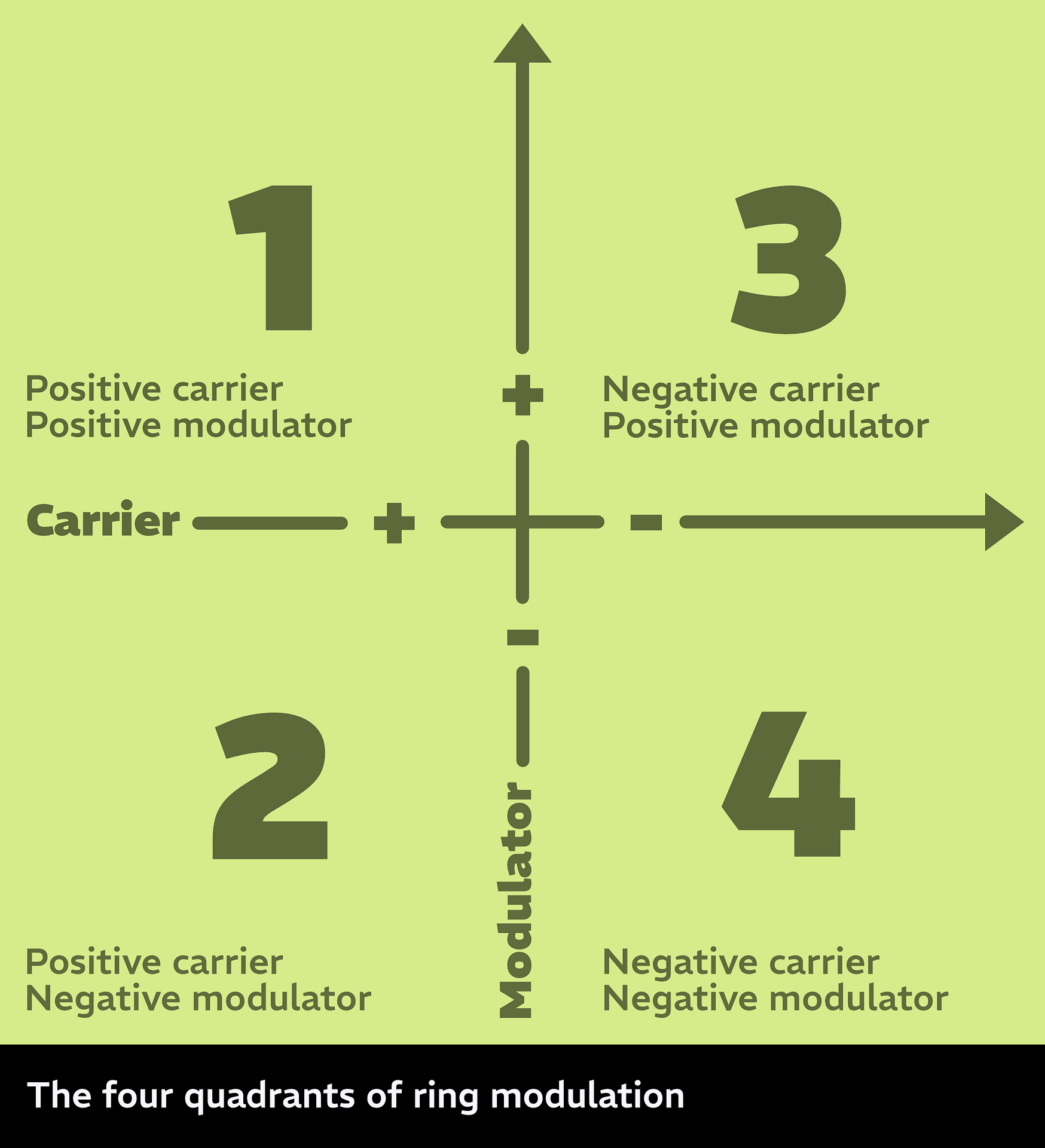 Technically speaking, ring modulation is often described as a four-quadrant multiplier. This means it multiplies both positive and negative voltages, allowing it to work with signals in all four quadrants: positive carrier/positive modulator, positive carrier/negative modulator, negative carrier/positive modulator, and negative carrier/negative modulator. This capability is what makes ring modulation capable of producing such a diverse range of sounds, as the multiplication of bipolar signals yields the complex sidebands that are central to its sound.