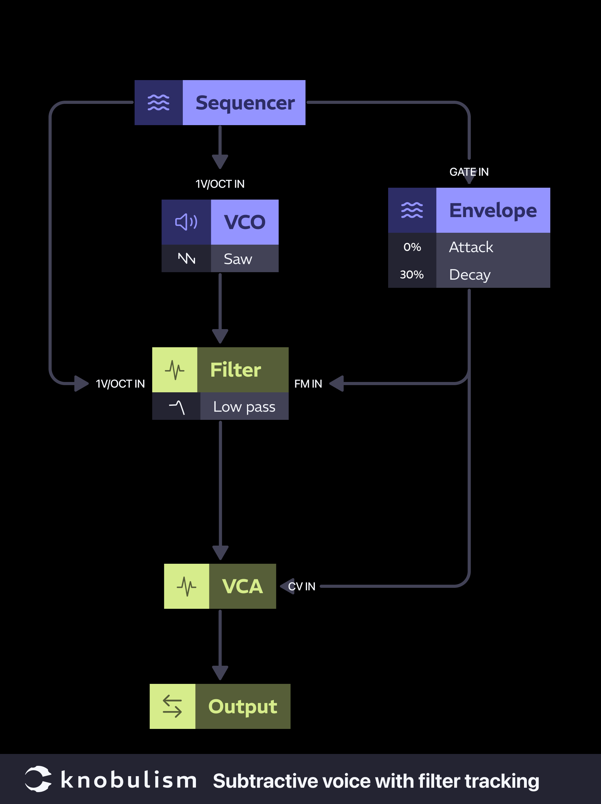 A highly resonant filter with no input can self-oscillate, producing a fairly pure sine wave. Since most filters track 1/v octave, you can use a resonant filter as an oscillator. A great application for this is to use it as an FM modulator, saving you from buying an additional oscillator. Try this patch out with your filter oscillator (the modulator) tuned up a fifth from the source oscillator (the carrier) and track both with the same pitch cv.