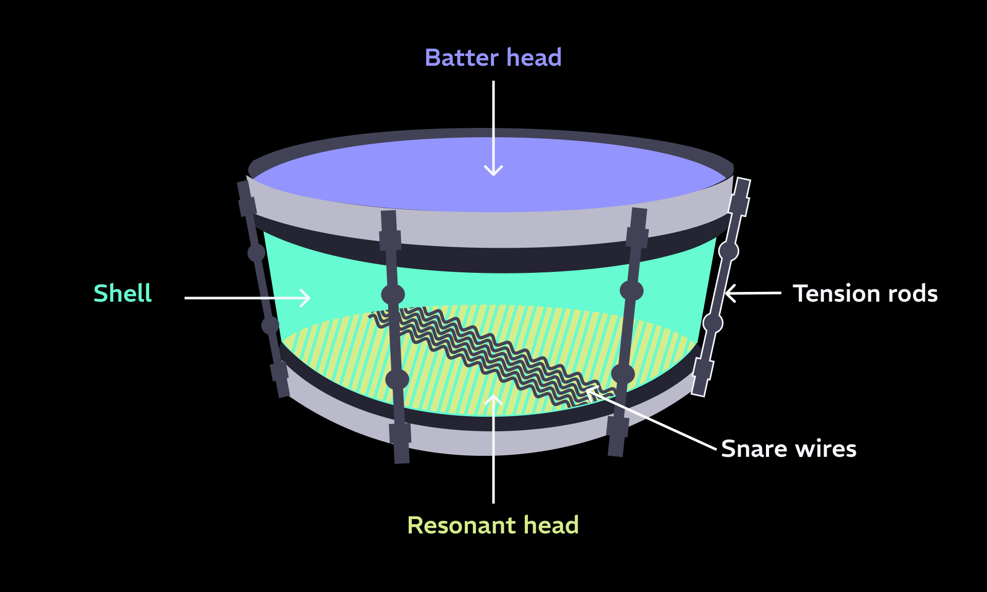 - Snare Wires: The spring-like wires on the bottom of the drum that vibrate when in contact with the resonant head, adding that noisy, snappy character.