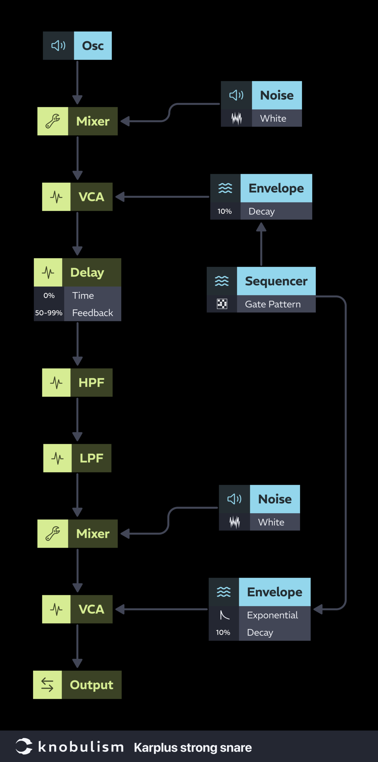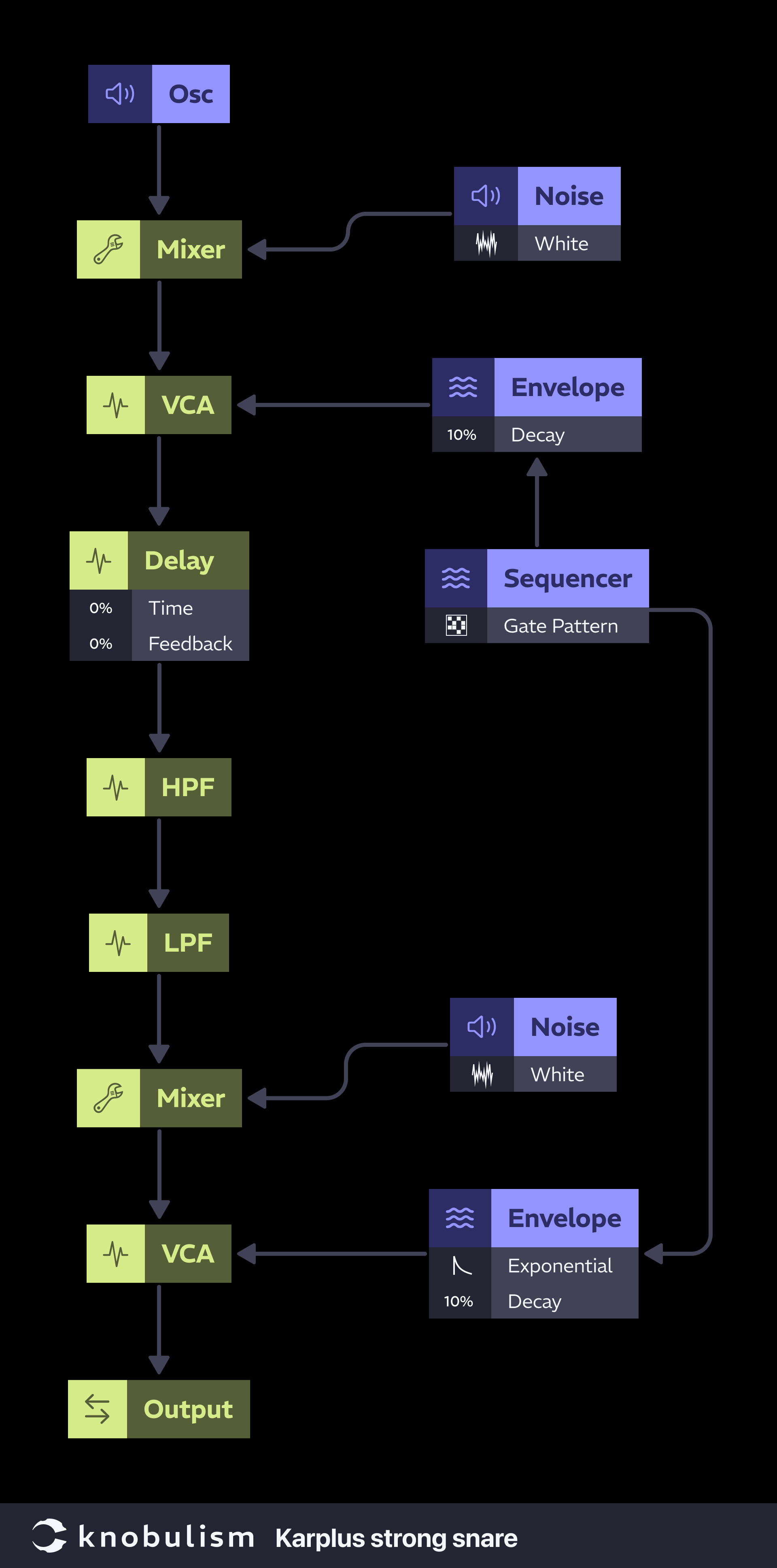 Translating sound design from software and a DAW to hardware isn’t always straightforward. I found myself pausing and rewinding the video to follow the signal flow. Early on, the creator mentioned using a “plain delay—not one with fancy panning or feedback.” This was confusing since “feedback” was in the video title. A bit more watching, and I realized he was unknowingly using Karplus-Strong synthesis to create the body and ring of the snare. He made a transient, used it as an impulse for a delay line, and manually fed it back into the signal. Honestly, a “fancy delay” with built-in feedback would’ve saved some time. That said, using Karplus-Strong synthesis was an interesting approach. I broke down the signal flow, simplified it, and applied it to some basic modules.