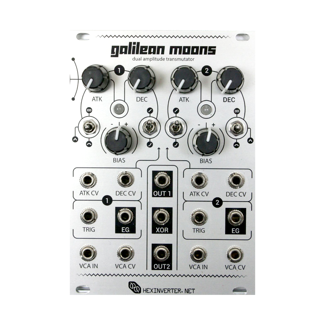 Hexinverter’s Galilean Moons combines two envelopes with built-in VCAs. Originally designed to pair with the Jupiter Storm noise module, creating a complete dr10um synth. The envelopes can be switched between linear and exponential curves, giving you even more control over the feel and response of your sounds.