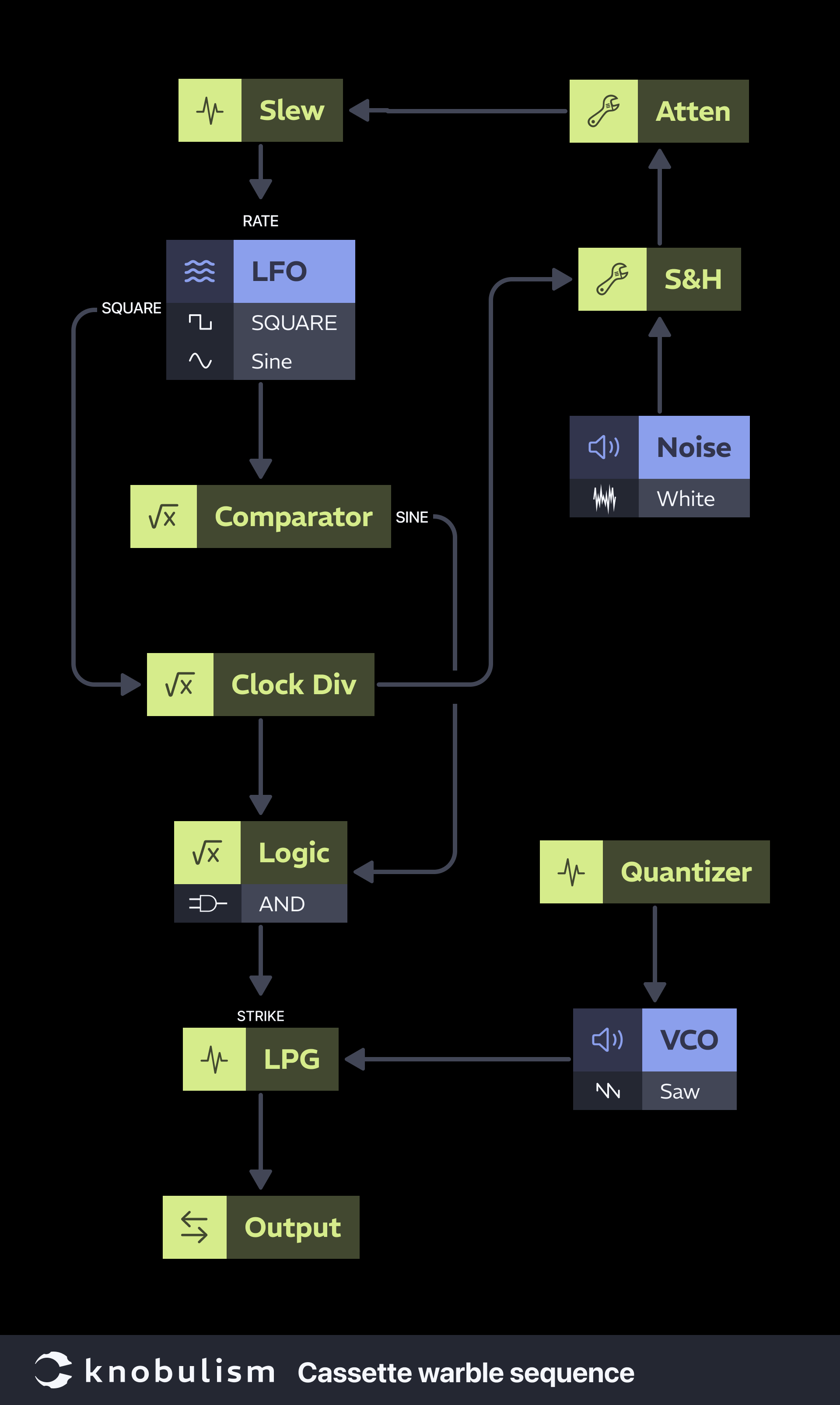 Let’s build on the last patch and mess with our clock’s speed. I grew up with cassettes, and one thing that always fascinated me was the random sway in tempo you’d hear when a tape was warped or the player wasn’t running smoothly. It made the recording feel stretchy and flexible, giving it a pleasant looseness that broke away from rigid timing. In this patch, we’ll use a smoothed random signal to gently nudge the clock speed, recreating that subtle, organic shift.