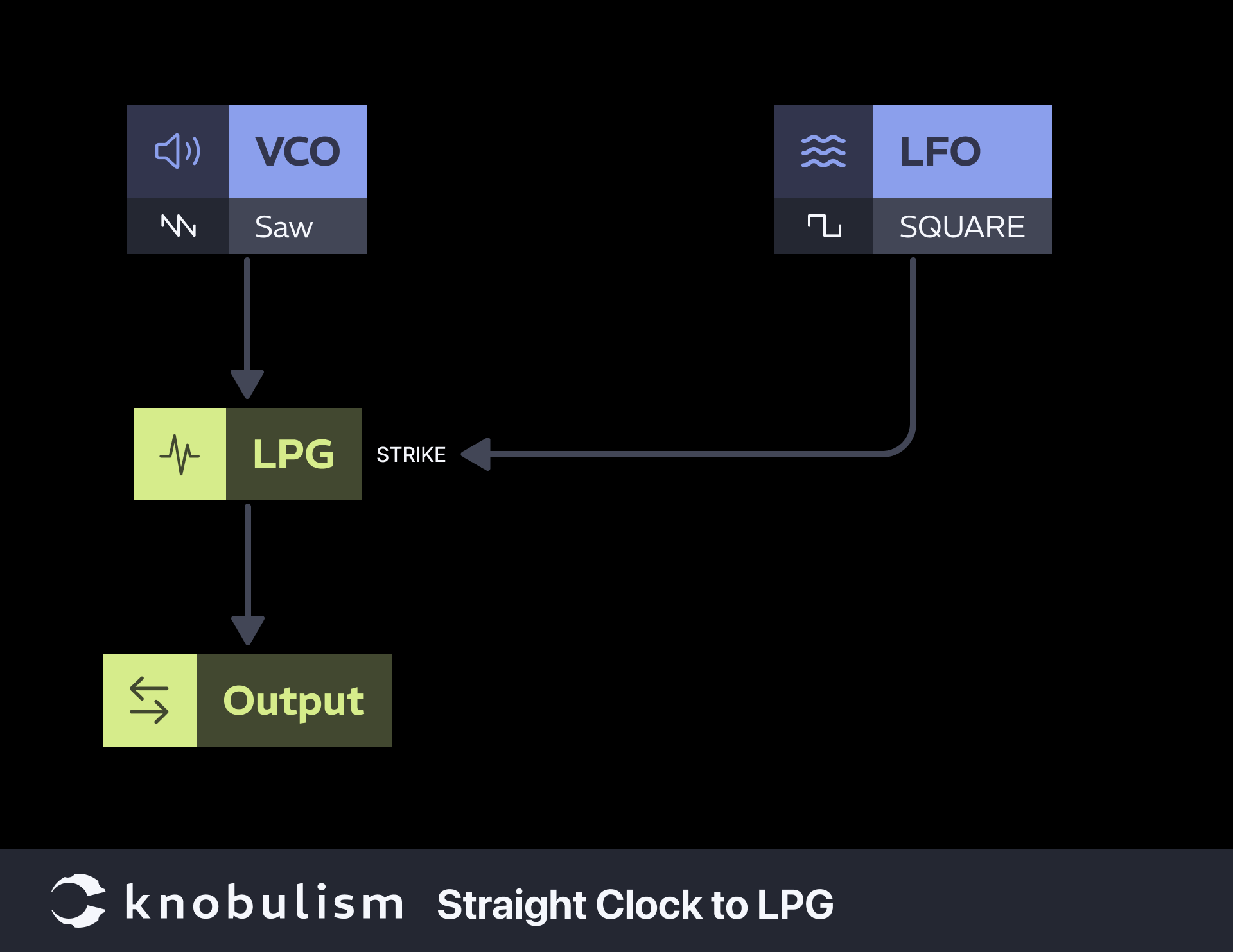 Let’s say you’ve got a steady clock striking a low-pass gate (LPG) fed with a harmonically rich waveform. The result? A never-ending stream of evenly spaced bonks.