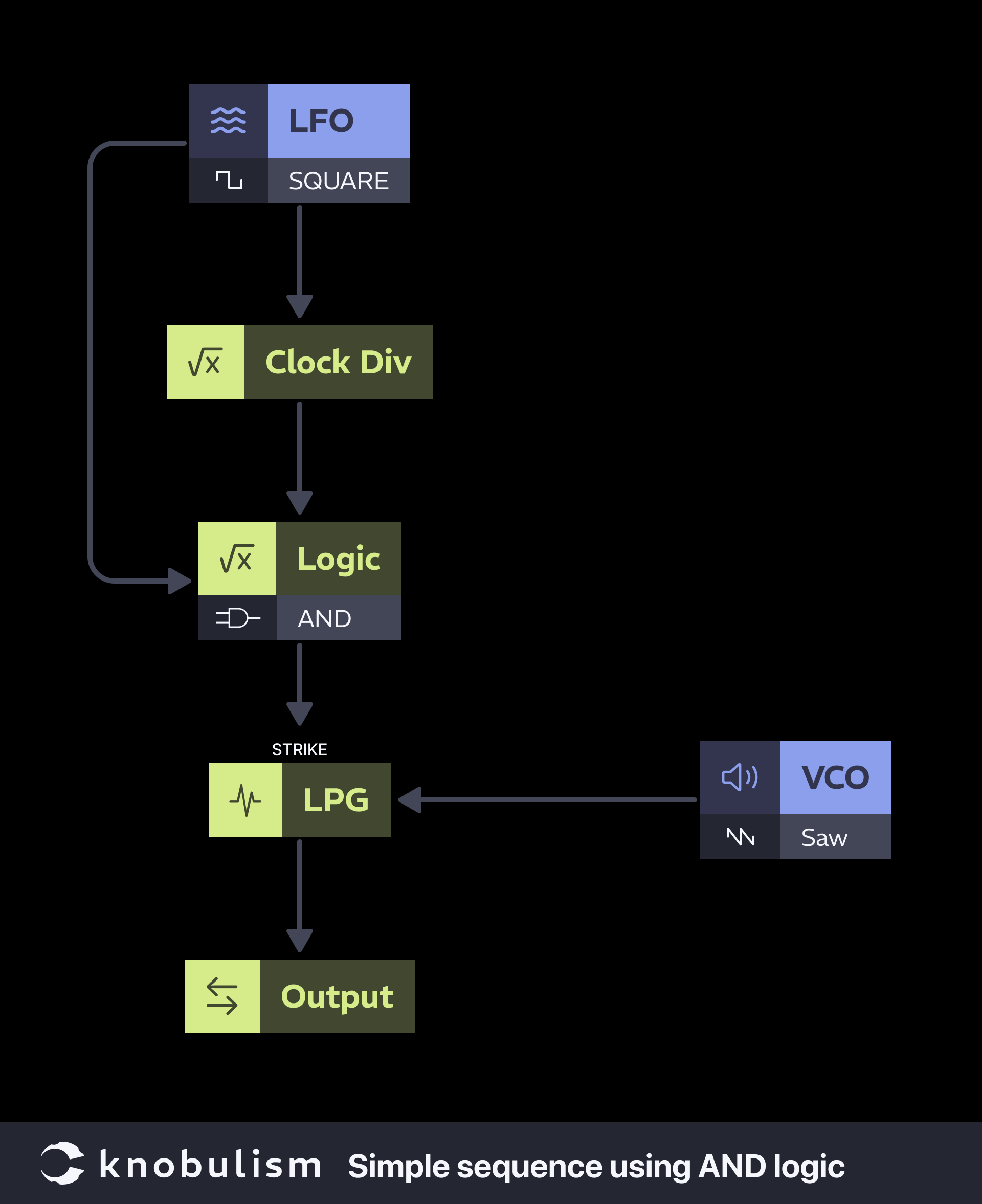 It’s cool at first, but that repetition will wear you down fast. To break things up, let’s bring in a second clock, or rather, the output of a clock divider, and use an AND logic gate to mix things up. If you don’t have a logic module, no worries: a simple VCA will get the job done too. (If you want to dig into why that works, check out my earlier post: Logic Modules Aren’t Only for Vulcans).