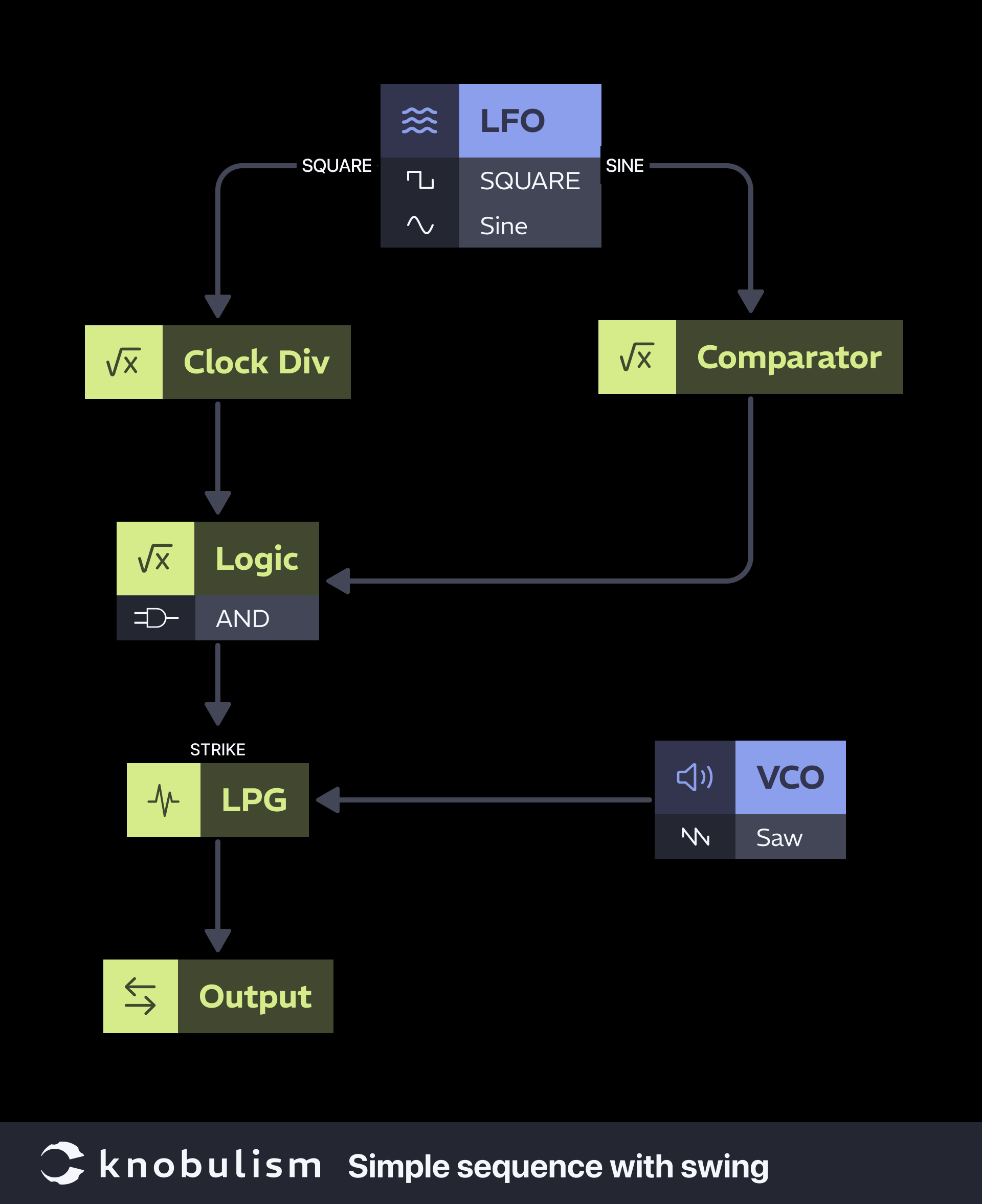 Cool! Now that we’ve built some rhythms, try experimenting with different divisions and logic types for added variation. You may notice, however, that the rhythms are still perfectly in sync and “on the grid.” Let’s address that with the next few patches.