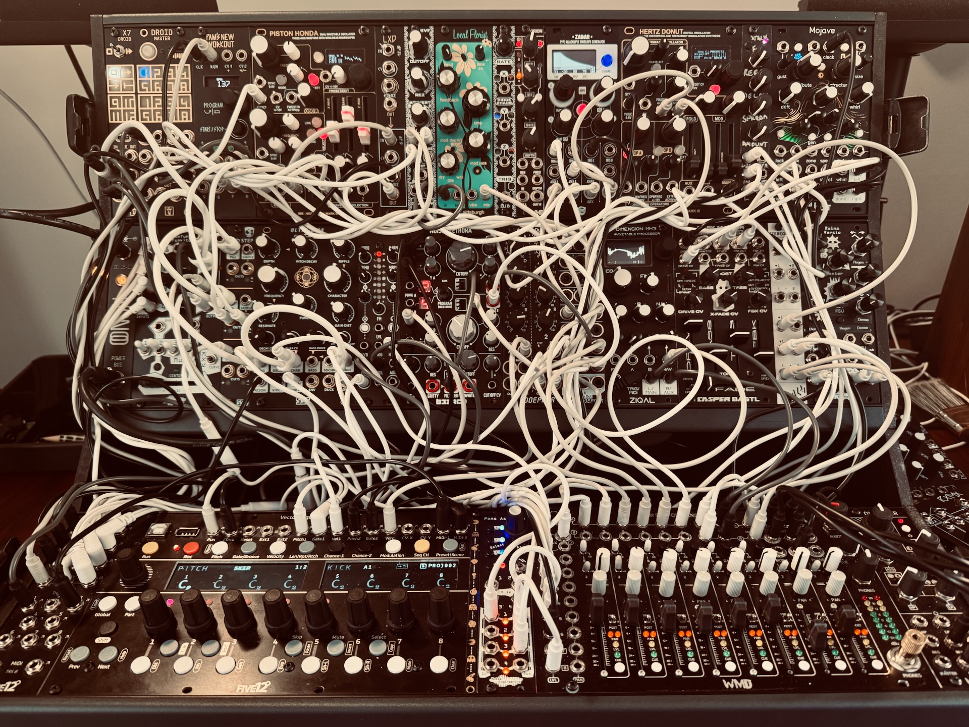 Once most of the set was worked out, I dove into rehearsals, improvising with the arrangement of patterns and testing various ways to shape the sound in real time by adjusting parameters. I looked for good swells, tension, release, and shifts in energy. This wasn’t just a show; it was a complex performance with intricately woven sequences, layered modulation, and ton of sub-sequences. I wanted the set to flow effortlessly, so I rehearsed a lot and often went back into refine sounds and sequences.