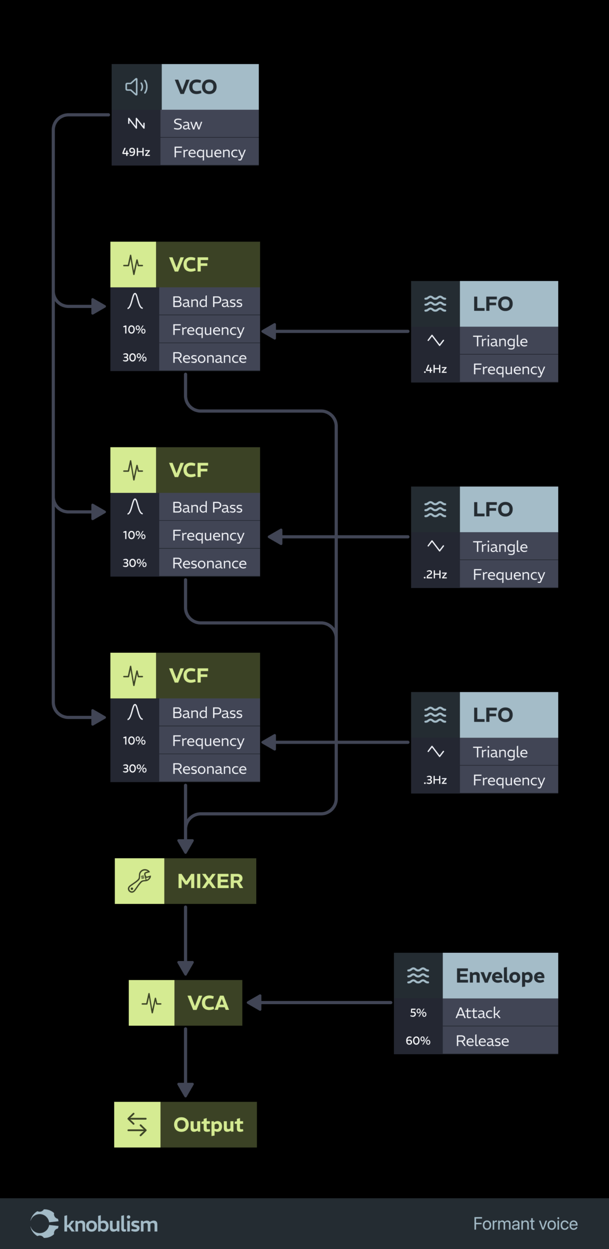 Each of these patches uses a band pass filter for a different result, but all keep the sound in a tighter frequency space than it would be with only high or low pass filters.
