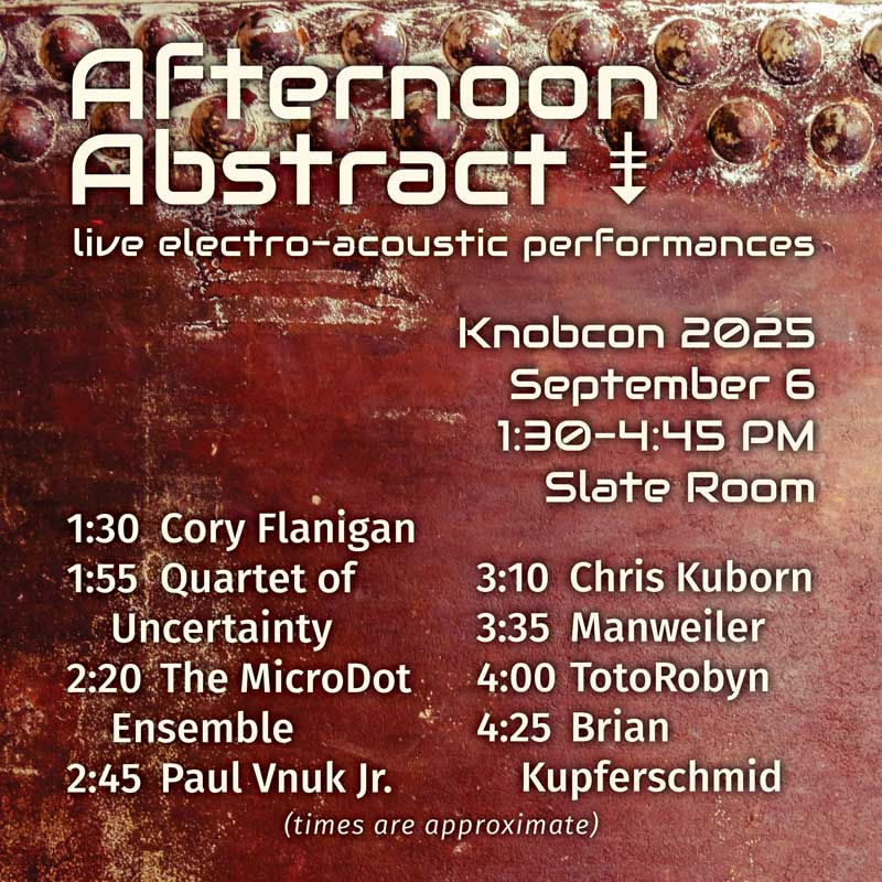 Afternoon Abstract: Primarily electro-acoustic and experimental acts. This started three years ago and has become one of the best curated shows at Knobcon.