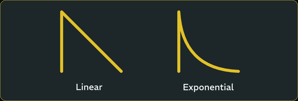 A Voltage-Controlled Amplifier (VCA) is a module that varies the amplitude of an incoming signal based on a control voltage. This control voltage can modulate either audio or another control voltage. Most VCAs are linear, meaning they respond to modulation by increasing or decreasing at the same rate and shape as the modulating signal. In contrast, exponential VCAs respond at an exponentially multiplied rate. For example, if the modulating signal is a falling ramp, a linear VCA will also fall at that rate, while an exponential VCA will fall at a continuously faster multiplied rate. This exponential response results in a doubling of the rate of fall if the exponent is roughly 2. The resulting shapes are depicted in the chart below.